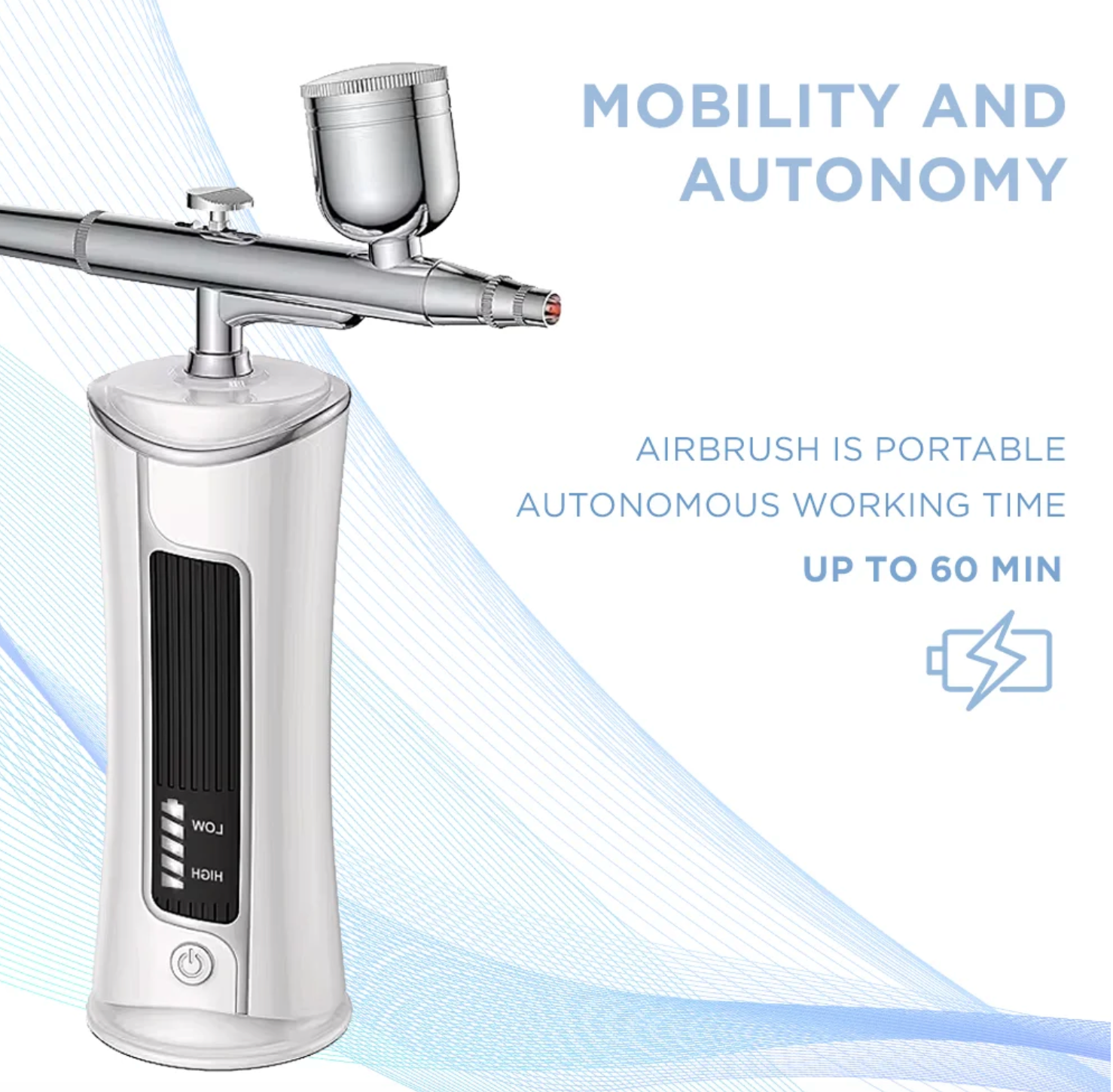 Die Airbrush sorgt für eine gleichmäßige Abdeckung des Bereichs mit Farbe und ermöglicht es, einen weichen Farbverlauf oder klare, grafische Linien zu erstellen. Dank der schnellen Ladefunktion über ein Typ-C-Kabel von jedem Gerät – Netzteil, Powerbank oder Laptop – bietet sie absolute Mobilität bei der Arbeit. Der integrierte Akku gewährleistet einen ununterbrochenen Betrieb von bis zu 60 Minuten.